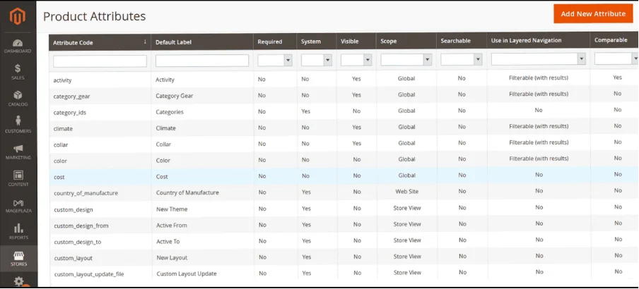 Even though there's no specific limit in Magento for managing the number of Stock Keeping Units (SKUs) a store can have, it's impractical to keep outdated products and categories on the website. Even if these items are not visible on the users' front end, Magento still processes them, causing a slowdown in the admin interface. The impact on Magento's performance becomes evident, especially with weaker configurations. While a robust server can handle thousands of SKUs seamlessly, even the most powerful hardware benefits from a bit of pruning to enhance its performance. Therefore, if your store is cluttered with hundreds, if not thousands, of unused products, it's advisable to remove them. This practice ensures faster database reading and searching operations. The attributes of products greatly influence the performance of the admin panel. A single product can have hundreds of attributes, and there are multiple attribute sets, leading to conflicting data that slows down the Magento backend. To address this, it's essential to remove any unused attributes from your store. Here's how you can delete attributes:- Navigate to the Magento admin panel and follow this path: Stores > Attributes > Product.